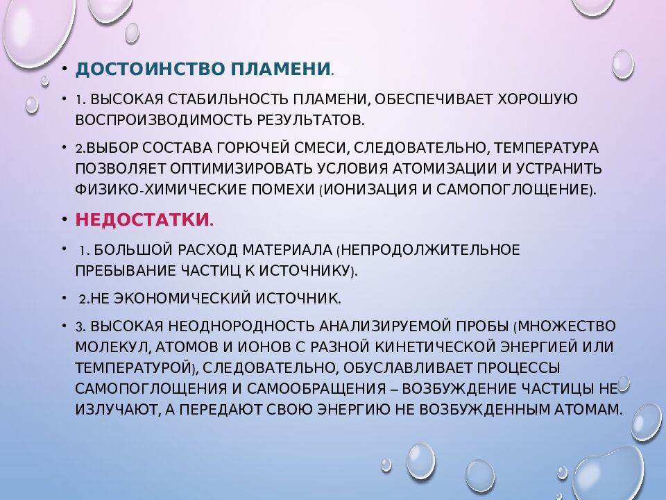 Достоинство пламени. 1. Высокая стабильность пламени, обеспечивает хорошую воспроизводимость результатов. 2.Выбор состава горючей смеси, следовательно, температура позволяет оптимизировать условия атомизации и устранить физико-химические помехи (ионизация и самопоглощение). Недостатки. 1. Большой расход материала (непродолжительное пребывание частиц к источнику ). 2.Не экономический источник. 3. Высокая неоднородность анализируемой пробы (множество молекул, атомов и ионов с разной кинетической энергией или температурой), следовательно, обуславливает процессы самопоглощения и самообращения – возбуждение частицы не излучают, а передают свою энергию не возбужденным атомам.
