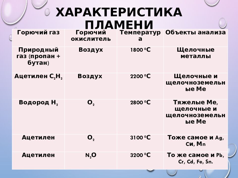 Горючий газ Горючий окислитель Температура Объекты анализа Природный газ (пропан + бутан) Воздух 1800 0 С Щелочные металлы Ацетилен С 2 Н 2 Воздух 2200 0 С Щелочные и щелочноземельные Ме Водород Н 2 О 2 2800 0 С Тяжелые Ме, щелочные и щелочноземельные Ме Ацетилен О 2 3100 0 С Тоже самое и Ag, C и, М n Ацетилен N 2 О 3200 0 С То же самое и Pb, Cr, Cd, Fe, Sn.