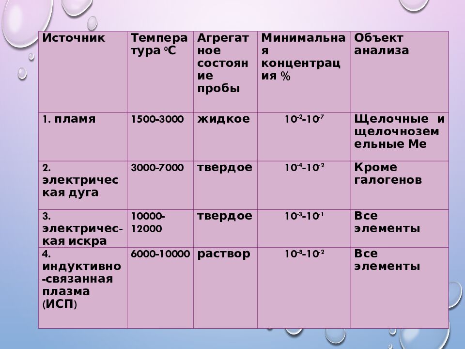 Источник Температура 0 С Агрегатное состояние пробы Минимальная концентрация % Объект анализа 1. пламя 1500-3000 жидкое 10 -2 -10 -7 Щелочные и щелочноземельные Ме 2. электрическая дуга 3000-7000 твердое 10 -4 -10 -2 Кроме галогенов 3. электричес -кая искра 10000-12000 твердое 10 -3 -10 -1 Все элементы 4. индуктивно-связанная плазма (ИСП) 6000-10000 раствор 10 -8 -10 -2 Все элементы
