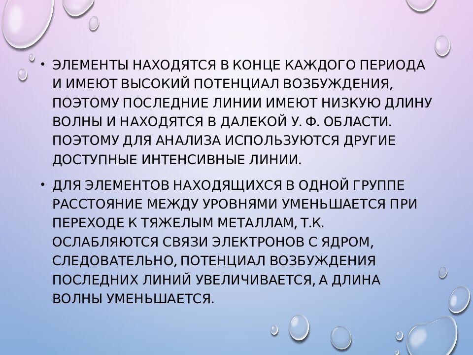 Элементы находятся в конце каждого периода и имеют высокий потенциал возбуждения, поэтому последние линии имеют низкую длину волны и находятся в далекой у. ф. области. Поэтому для анализа используются другие доступные интенсивные линии. Для элементов находящихся в одной группе расстояние между уровнями уменьшается при переходе к тяжелым металлам, т.к. ослабляются связи электронов с ядром, следовательно, потенциал возбуждения последних линий увеличивается, а длина волны уменьшается.
