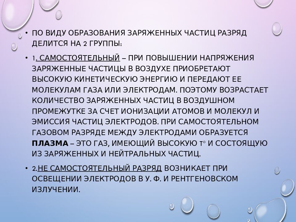 По виду образования заряженных частиц разряд делится на 2 группы : 1. Самостоятельный – при повышении напряжения заряженные частицы в воздухе приобретают высокую кинетическую энергию и передают ее молекулам газа или электродам. Поэтому возрастает количество заряженных частиц в воздушном промежутке за счет ионизации атомов и молекул и эмиссия частиц электродов. При самостоятельном газовом разряде между электродами образуется плазма – это газ, имеющий высокую t и состоящую из заряженных и нейтральных частиц. 2. Не самостоятельный разряд возникает при освещении электродов в у. ф. и рентгеновском излучении.