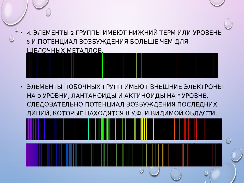 4. Элементы 2 группы имеют нижний терм или уровень S и потенциал возбуждения больше чем для щелочных металлов. Элементы побочных групп имеют внешние электроны на d уровни, лантаноиды и актиноиды на f уровне, следовательно потенциал возбуждения последних линий, которые находятся в у.ф. и видимой области.