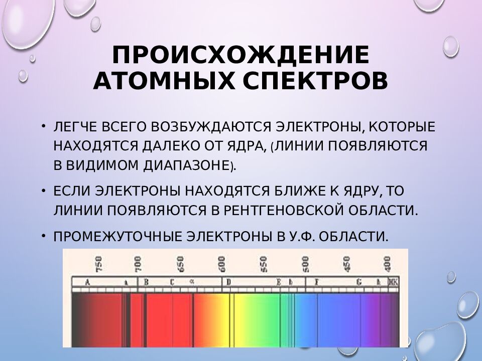Легче всего возбуждаются электроны, которые находятся далеко от ядра, (линии появляются в видимом диапазоне). Если электроны находятся ближе к ядру, то линии появляются в рентгеновской области. Промежуточные электроны в у.ф. области.