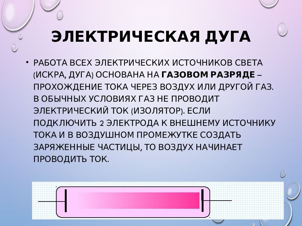 Работа всех электрических источников света (искра, дуга) основана на газовом разряде – прохождение тока через воздух или другой газ. В обычных условиях газ не проводит электрический ток (изолятор). Если подключить 2 электрода к внешнему источнику тока и в воздушном промежутке создать заряженные частицы, то воздух начинает проводить ток.