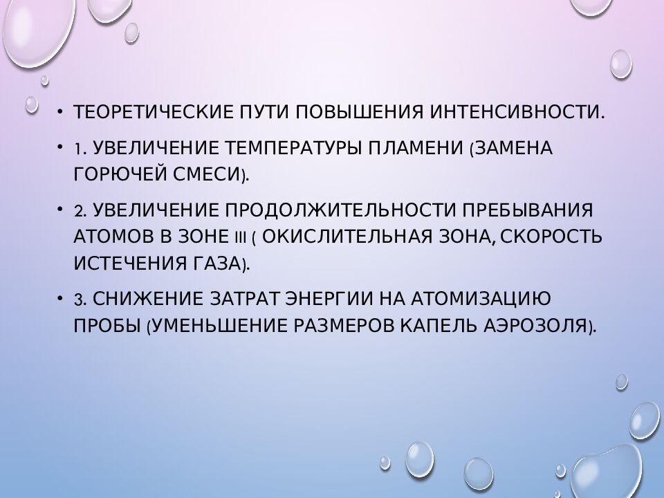 Теоретические пути повышения интенсивности. 1. Увеличение температуры пламени (замена горючей смеси). 2. Увеличение продолжительности пребывания атомов в зоне III ( окислительная зона, скорость истечения газа). 3. Снижение затрат энергии на атомизацию пробы (уменьшение размеров капель аэрозоля).