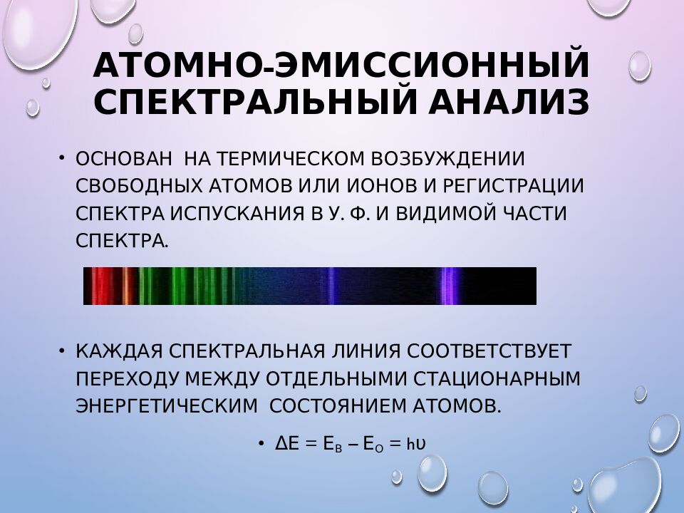 Основан на термическом возбуждении свободных атомов или ионов и регистрации спектра испускания в у. ф. и видимой части спектра. Каждая спектральная линия соответствует переходу между отдельными стационарным энергетическим состоянием атомов. Δ Е = Е в – Е о = hυ
