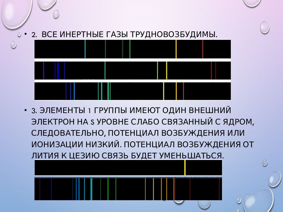 2. Все инертные газы трудновозбудимы. 3. Элементы 1 группы имеют один внешний электрон на S уровне слабо связанный с ядром, следовательно, потенциал возбуждения или ионизации низкий. потенциал возбуждения от лития к цезию связь будет уменьшаться.
