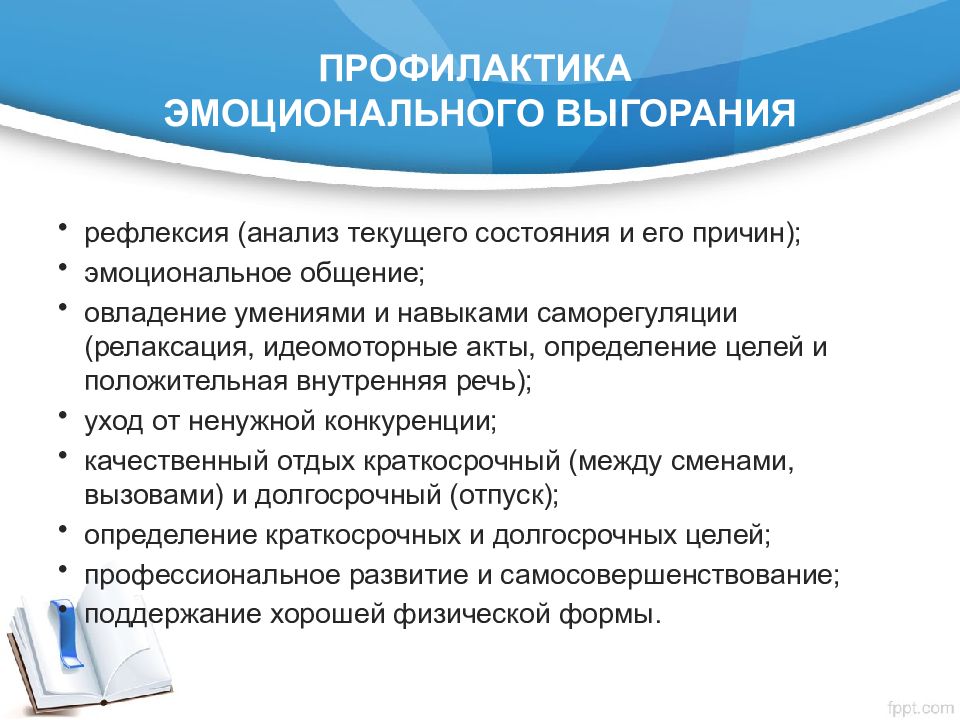 р ефлексия (анализ текущего состояния и его причин); эмоциональное общение; овладение умениями и навыками саморегуляции (релаксация, идеомоторные акты, определение целей и положительная внутренняя речь); уход от ненужной конкуренции; качественный отдых краткосрочный (между сменами, вызовами ) и долгосрочный (отпуск ); определение краткосрочных и долгосрочных целей; профессиональное развитие и самосовершенствование; поддержание хорошей физической формы. ПРОФИЛАКТИКА ЭМОЦИОНАЛЬНОГО ВЫГОРАНИЯ