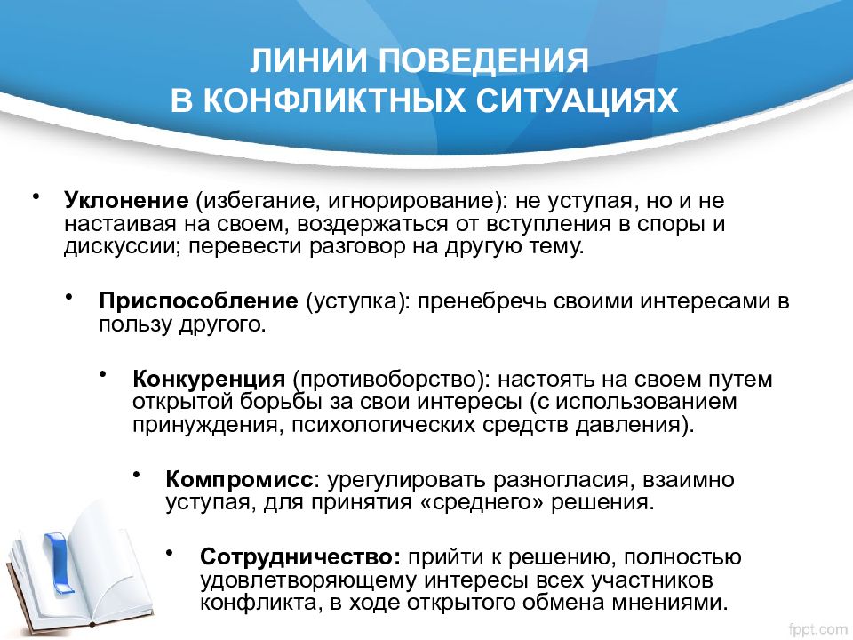 Уклонение (избегание, игнорирование): не уступая, но и не настаивая на своем, воздержаться от вступления в споры и дискуссии; перевести разговор на другую тему. Приспособление (уступка): пренебречь своими интересами в пользу другого. Конкуренция (противоборство): настоять на своем путем открытой борьбы за свои интересы (с использованием принуждения, психологических средств давления). Компромисс : урегулировать разногласия, взаимно уступая, для принятия «среднего» решения. Сотрудничество: прийти к решению, полностью удовлетворяющему интересы всех участников конфликта, в ходе открытого обмена мнениями.
