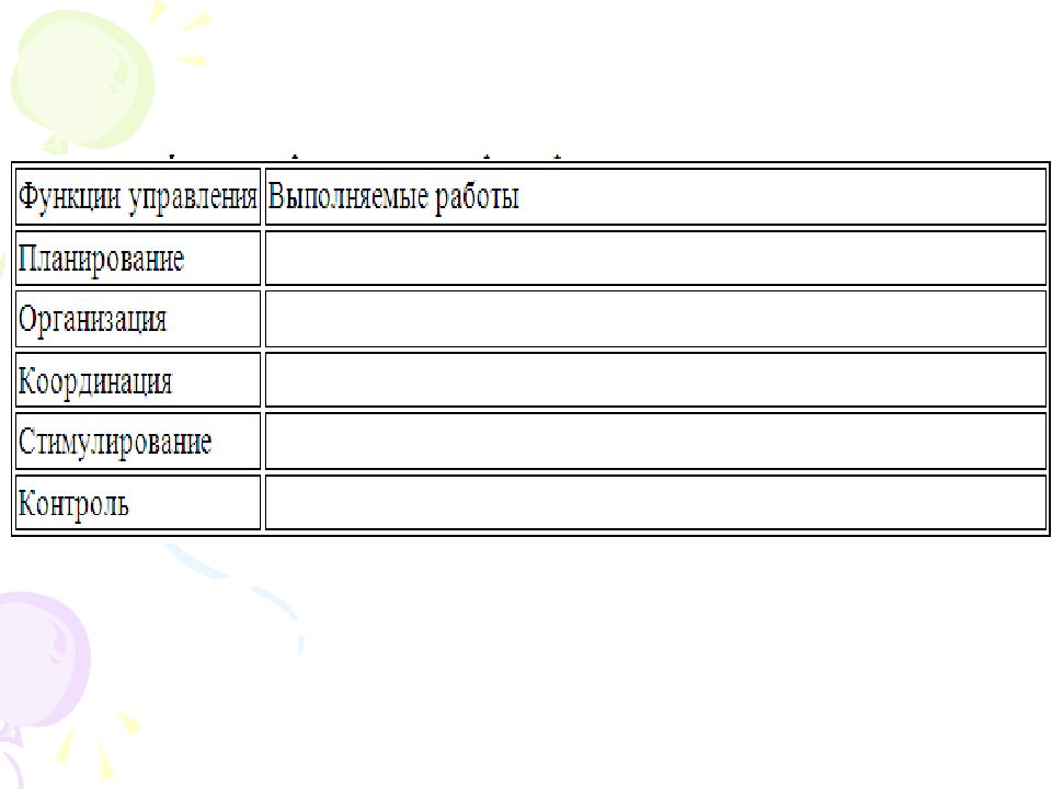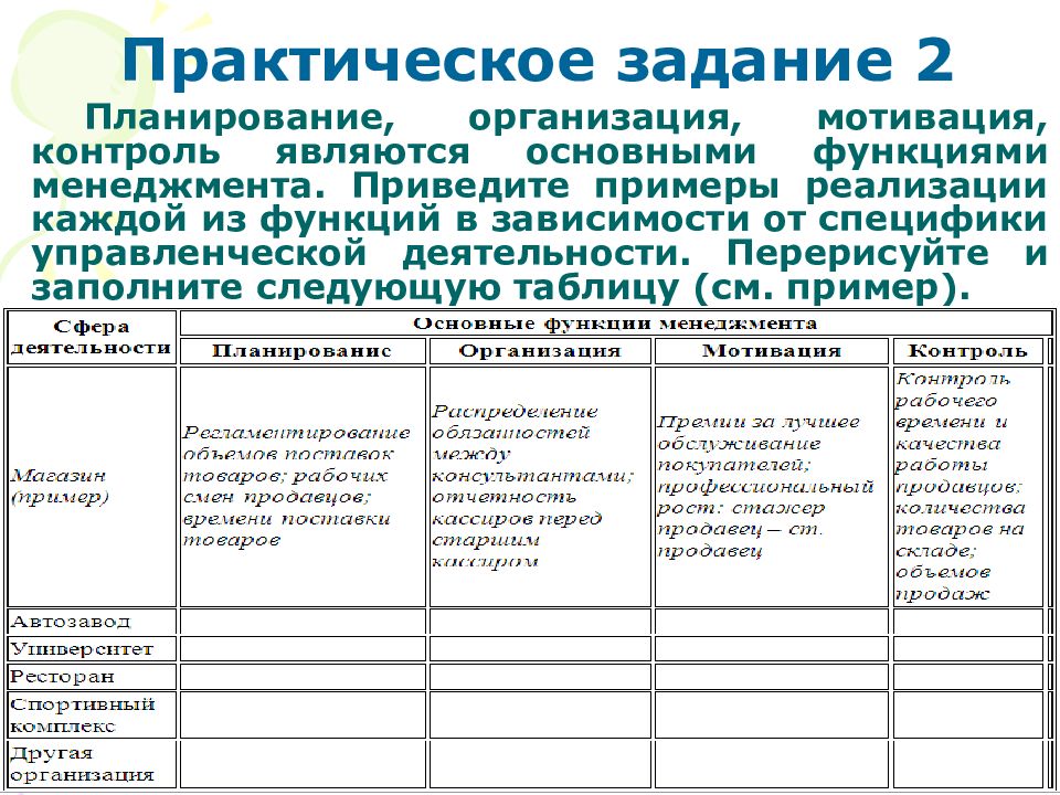 Планирование, организация, мотивация, контроль являются основными функциями менеджмента. Приведите примеры реализации каждой из функций в зависимости от специфики управленческой деятельности. Перерисуйте и заполните следующую таблицу (см. пример).