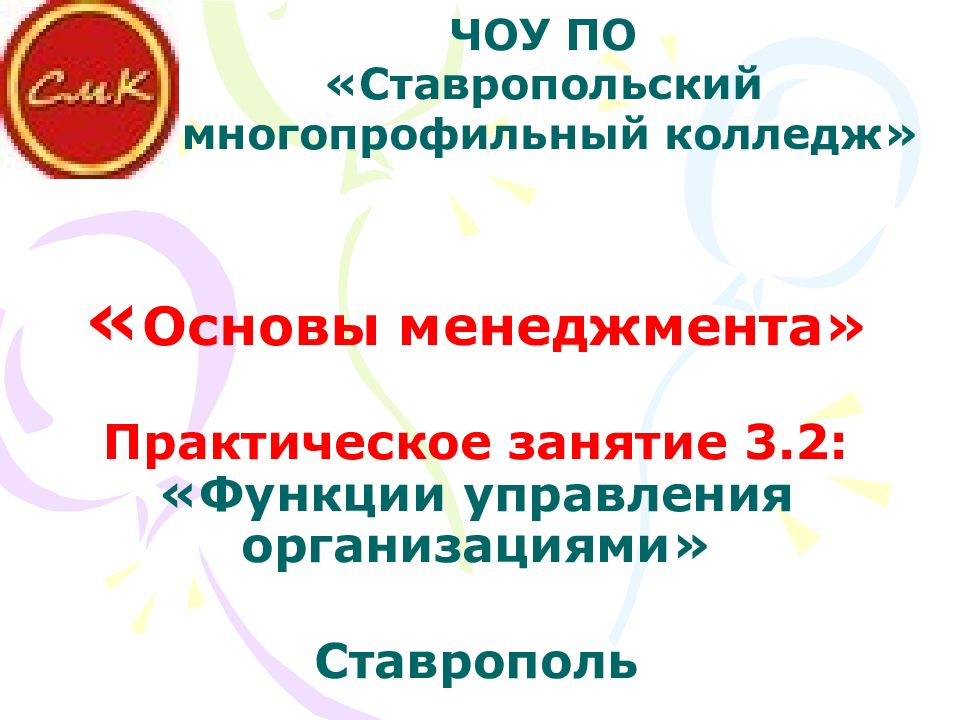 Первый слайд презентации: Основы менеджмента» Практическое занятие 3.2: «Функции управления организациями» Ставрополь