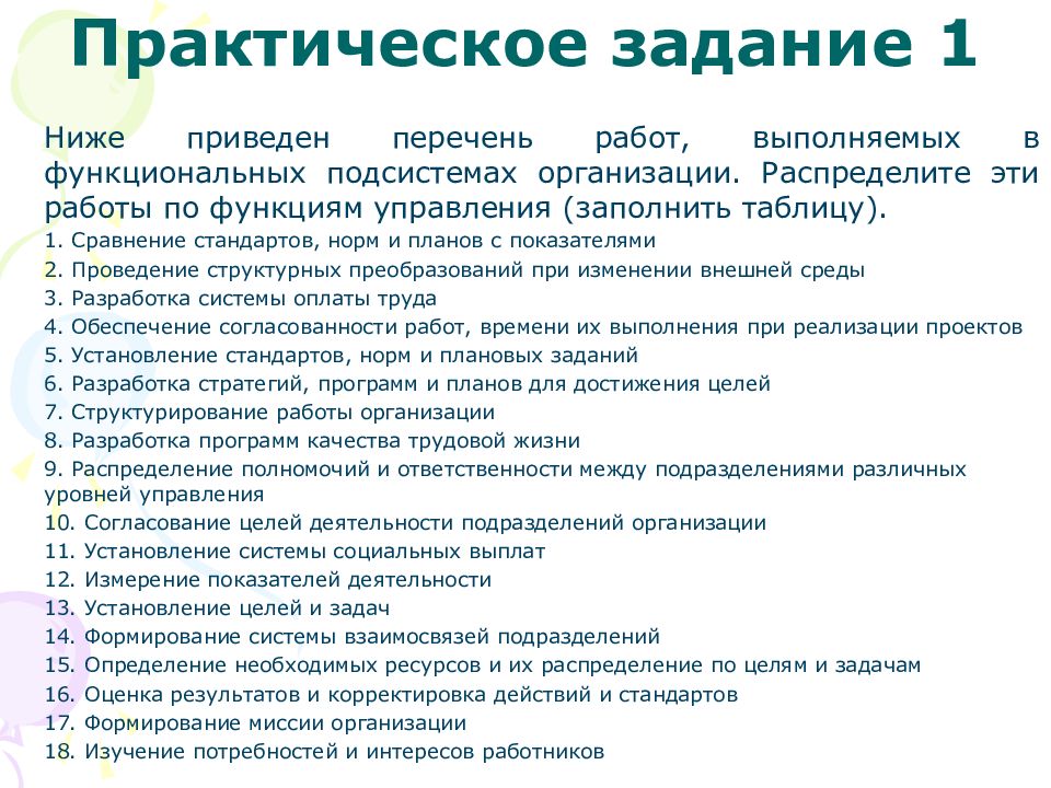 Ниже приведен перечень работ, выполняемых в функциональных подсистемах организации. Распределите эти работы по функциям управления (заполнить таблицу). 1. Сравнение стандартов, норм и планов с показателями 2. Проведение структурных преобразований при изменении внешней среды 3. Разработка системы оплаты труда 4. Обеспечение согласованности работ, времени их выполнения при реализации проектов 5. Установление стандартов, норм и плановых заданий 6. Разработка стратегий, программ и планов для достижения целей 7. Структурирование работы организации 8. Разработка программ качества трудовой жизни 9. Распределение полномочий и ответственности между подразделениями различных уровней управления 10. Согласование целей деятельности подразделений организации 11. Установление системы социальных выплат 12. Измерение показателей деятельности 13. Установление целей и задач 14. Формирование системы взаимосвязей подразделений 15. Определение необходимых ресурсов и их распределение по целям и задачам 16. Оценка результатов и корректировка действий и стандартов 17. Формирование миссии организации 18. Изучение потребностей и интересов работников