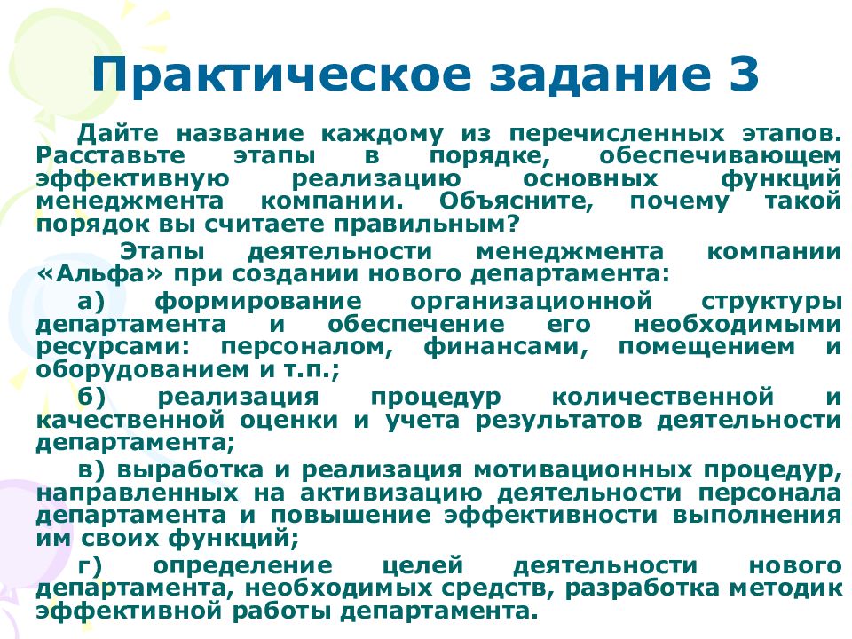 Дайте название каждому из перечисленных этапов. Расставьте этапы в порядке, обеспечивающем эффективную реализацию основных функций менеджмента компании. Объясните, почему такой порядок вы считаете правильным? Этапы деятельности менеджмента компании «Альфа» при создании нового департамента: а) формирование организационной структуры департамента и обеспечение его необходимыми ресурсами: персоналом, финансами, помещением и оборудованием и т.п.; б) реализация процедур количественной и качественной оценки и учета результатов деятельности департамента; в) выработка и реализация мотивационных процедур, направленных на активизацию деятельности персонала департамента и повышение эффективности выполнения им своих функций; г) определение целей деятельности нового департамента, необходимых средств, разработка методик эффективной работы департамента.