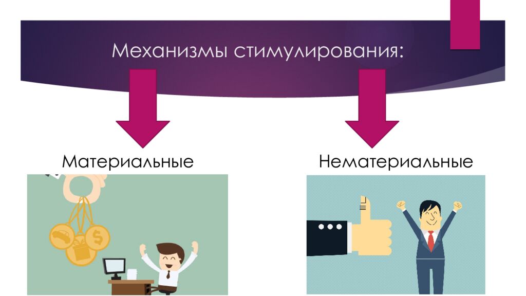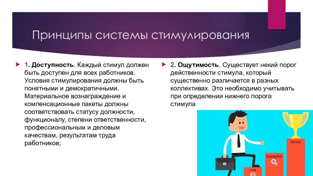 1. Доступность. Каждый стимул должен быть доступен для всех работников. Условия стимулирования должны быть понятными и демократичными. Материальное вознаграждение и компенсационные пакеты должны соответствовать статусу должности, функционалу, степени ответственности, профессиональным и деловым качествам, результатам труда работников; 2. Ощутимость. Существует некий порог действенности стимула, который существенно различается в разных коллективах. Это необходимо учитывать при определении нижнего порога стимула