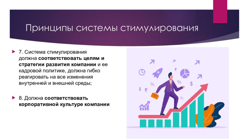 7. Система стимулирования должна соответствовать целям и стратегии развития компании и ее кадровой политике, должна гибко реагировать на все изменения внутренней и внешней среды; 8. Должна соответствовать корпоративной культуре компании Принципы системы стимулирования