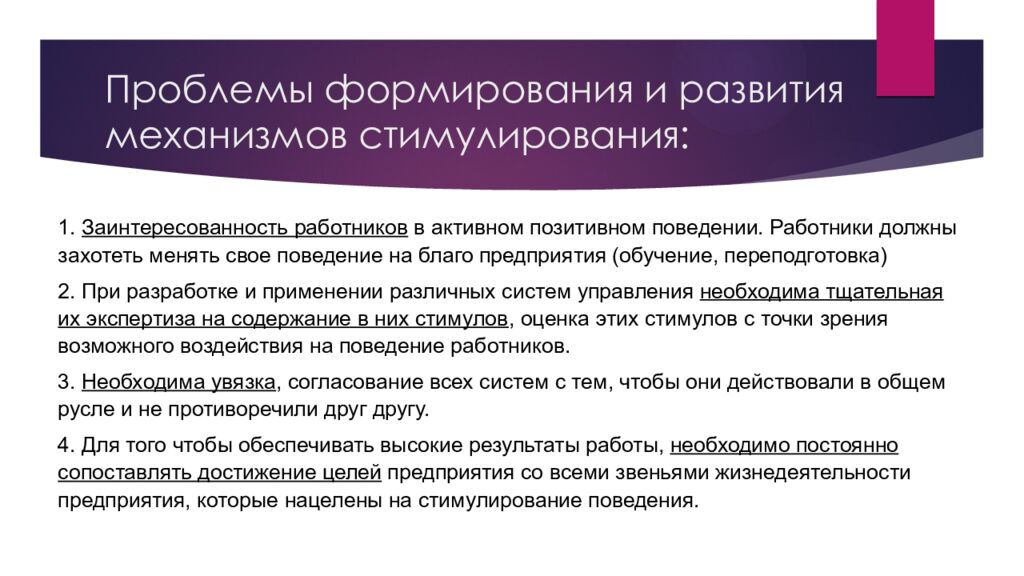 1. Заинтересованность работников в активном позитивном поведении. Работники должны захотеть менять свое поведение на благо предприятия (обучение, переподготовка) 2. При разработке и применении различных систем управления необходима тщательная их экспертиза на содержание в них стимулов, оценка этих стимулов с точки зрения возможного воздействия на поведение работников. 3. Необходима увязка, согласование всех систем с тем, чтобы они действовали в общем русле и не противоречили друг другу. 4. Для того чтобы обеспечивать высокие результаты работы, необходимо постоянно сопоставлять достижение целей предприятия со всеми звеньями жизнедеятельности предприятия, которые нацелены на стимулирование поведения.