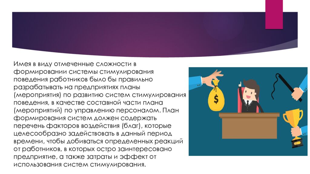 Имея в виду отмеченные сложности в формировании системы стимулирования поведения работников было бы правильно разрабатывать на предприятиях планы (мероприятия) по развитию систем стимулирования поведения, в качестве составной части плана (мероприятий) по управлению персоналом. План формирования систем должен содержать перечень факторов воздействия (благ), которые целесообразно задействовать в данный период времени, чтобы добиваться определенных реакций от работников, в которых остро заинтересовано предприятие, а также затраты и эффект от использования систем стимулирования.