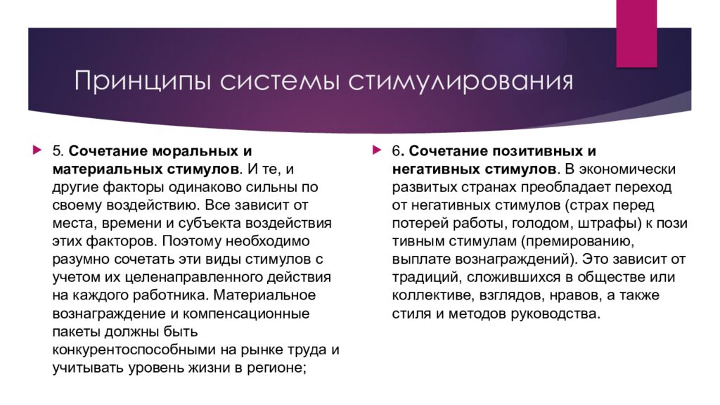 5. Сочетание моральных и материальных стимулов. И те, и другие факторы одинаково сильны по своему воздействию. Все зависит от места, времени и субъекта воздействия этих факторов. Поэтому необходимо разумно сочетать эти виды стимулов с учетом их целенаправленного действия на каждого работника. Материальное вознаграждение и компенсационные пакеты должны быть конкурентоспособными на рынке труда и учитывать уровень жизни в регионе; 6. Сочетание позитивных и негативных стимулов. В экономически развитых странах преобладает переход от негативных стимулов (страх перед потерей работы, голодом, штрафы) к позитивным стимулам (премированию, выплате вознаграждений). Это зависит от традиций, сложившихся в обществе или коллективе, взглядов, нравов, а также стиля и методов руководства. Принципы системы стимулирования