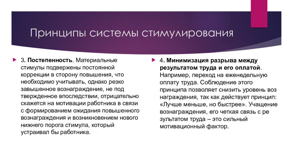 3. Постепенность. Материальные стимулы подвержены постоянной коррекции в сторону повышения, что необходимо учитывать, однако резко завышенное вознаграждение, не подтвержденное впоследствии, отрицательно скажется на мотивации работника в связи с формированием ожидания повышенного вознаграждения и возникновением нового нижнего порога стимула, который устраивал бы работника. 4. Минимизация разрыва между результатом труда и его оплатой. Например, переход на еженедельную оплату труда. Соблюдение этого принципа позволяет снизить уровень вознаграждения, так как действует принцип: «Лучше меньше, но быстрее». Учащение вознаграждения, его четкая связь с результатом труда – это сильный мотивационный фактор. Принципы системы стимулирования