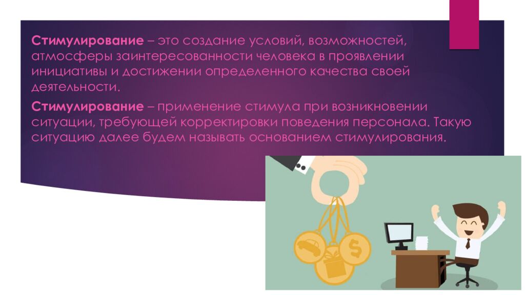 Стимулирование – это создание условий, возможностей, атмосферы заинтересованности человека в проявлении инициативы и достижении определенного качества своей деятельности. Стимулирование – применение стимула при возникновении ситуации, требующей корректировки поведения персонала. Такую ситуацию далее будем называть основанием стимулирования.