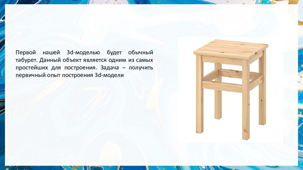 Первой нашей 3 d- моделью будет обычный табурет. Данный объект является одним из самых простейших для построения. Задача – получить первичный опыт построени я 3 d- модели