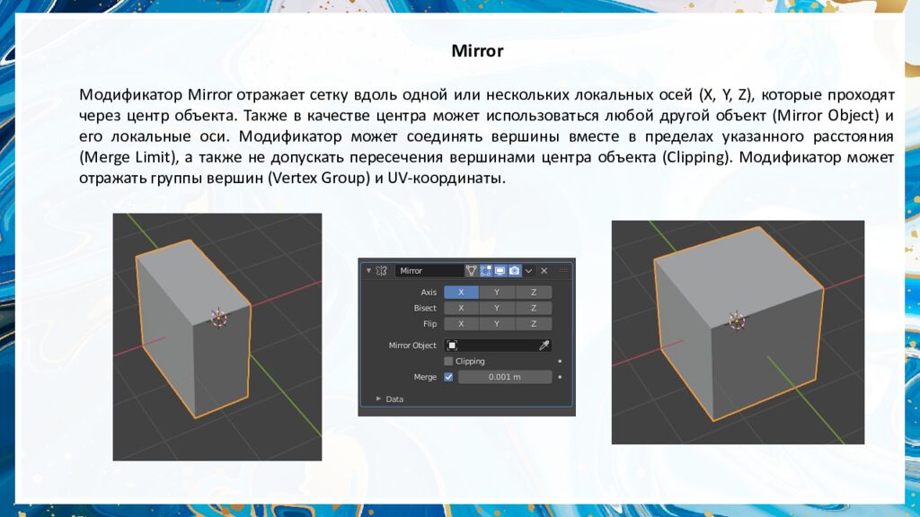 Mirror Модификатор Mirror отражает сетку вдоль одной или нескольких локальных осей (X, Y, Z), которые проходят через центр объекта. Также в качестве центра может использоваться любой другой объект ( Mirror Object ) и его локальные оси. Модификатор может соединять вершины вместе в пределах указанного расстояния ( Merge Limit ), а также не допускать пересечения вершинами центра объекта ( Clipping ). Модификатор может отражать группы вершин ( Vertex Group ) и UV-координаты.