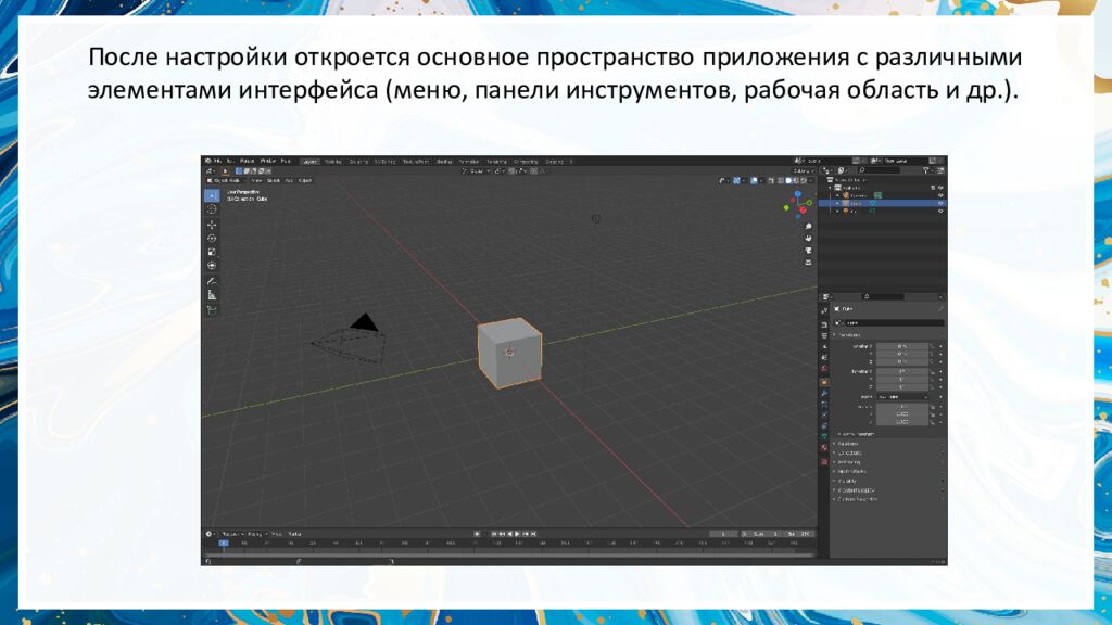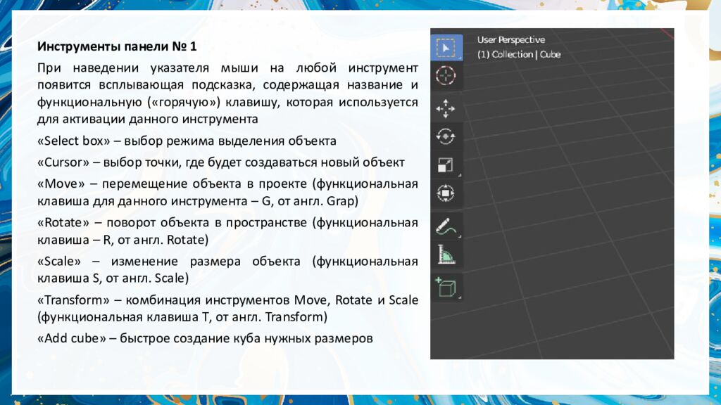 Инструменты па нели № 1 При наведении указателя мыши на любой инструмент появится всплывающая подсказка, содержащая название и функциональную («горячую») клавишу, которая используется для активации данного инструмента « Select box » – выбор режима выделения объекта « Cursor » – выбор точки, где будет создаваться новый объект « Move » – перемещение объекта в проекте (функциональная клавиша для данного инструмента – G, от англ. Grap ) « Rotate » – поворот объекта в пространстве (функциональная клавиша – R, от англ. Rotate ) « Scale » – изменение размера объекта (функциональная клавиша S, от англ. Scale ) « Transform » – комбинация инструментов Move, Rotate и Scale (функциональная клавиша T, от англ. Transform ) « Add cube » – быстрое создание куба нужных размеров