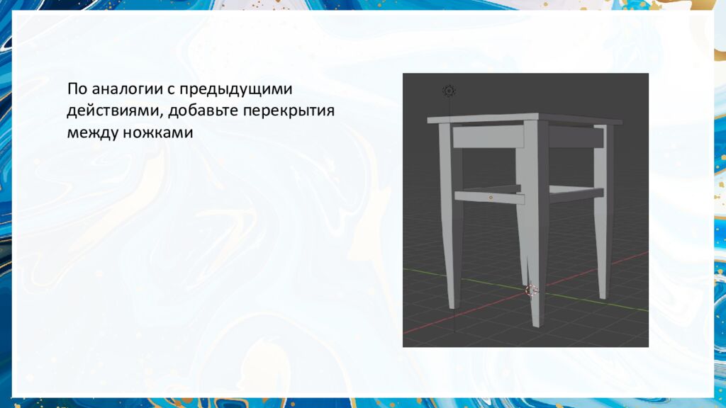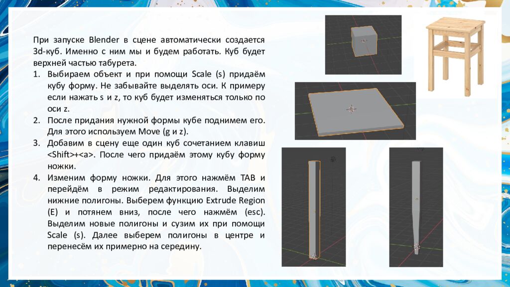 При запуске Blender в сцене автоматически создается 3 d - куб. Именно с ним мы и будем работать. Куб будет верхней частью табурета. Выбираем объект и при помощи S cale (s) придаём кубу форму. Не забывайте выделять оси. К примеру если нажать s и z, то куб будет изменяться только по оси z. После придания нужной формы куб e поднимем его. Для этого используем Move (g и z ). Добавим в сцену еще один куб сочетанием клавиш < Shift>+<a>. После чего придаём этому кубу форму ножки. И зменим форму ножки. Для этого нажмём TAB и перейдём в режим редактирования. Выделим нижние полигоны. Выберем функцию Extrude Region ( E) и потянем вниз, после чего нажмём (esc). Выделим новые полигоны и сузим их при помощи S cale ( s). Далее выберем полигоны в центре и перенесём их примерно на середину.