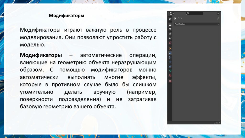 Модификаторы Модификаторы играют важную роль в процессе моделирования. Они позволяют упростить работу с моделью. Модификаторы – автоматические операции, влияющие на геометрию объекта неразрушающим образом. С помощью модификаторов можно автоматически выполнять многие эффекты, которые в противном случае было бы слишком утомительно делать вручную (например, поверхности подразделения) и не затрагивая базовую геометрию вашего объекта.