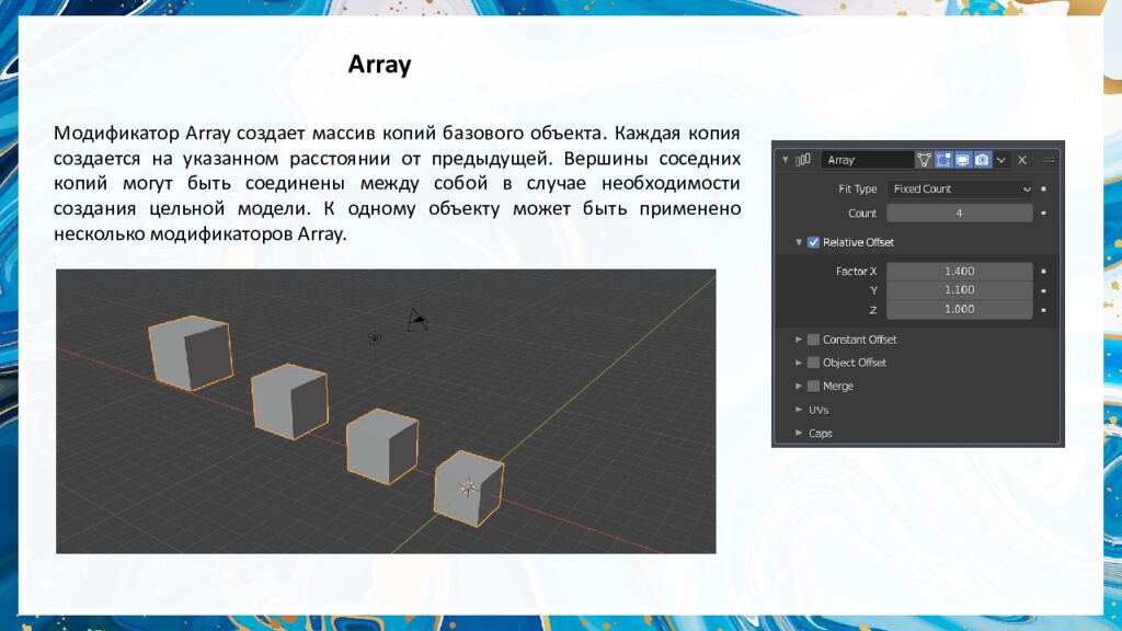 Array Модификатор Array создает массив копий базового объекта. Каждая копия создается на указанном расстоянии от предыдущей. Вершины соседних копий могут быть соединены между собой в случае необходимости создания цельной модели. К одному объекту может быть применено несколько модификаторов Array.