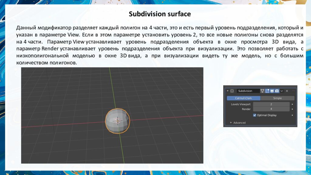 Subdivision surface Данный м одификатор разделяет каждый полигон на 4 части, это и есть первый уровень подразделения, который и указан в параметре View. Если в этом параметре установить уровень 2, то все новые полигоны снова разделятся на 4 части. Параметр View устанавливает уровень подразделения объекта в окне просмотра 3D вида, а параметр Render устанавливает уровень подразделения объекта при визуализации. Это позволяет работать с низкополигональной моделью в окне 3D вида, а при визуализации видеть ту же модель, но с большим количеством полигонов.