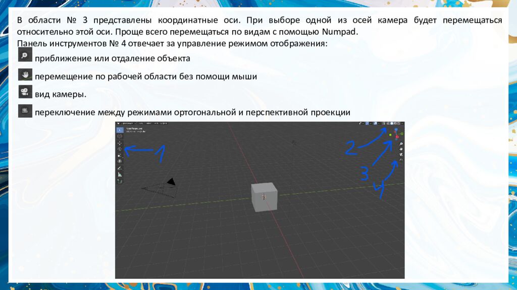 В области № 3 представлены координатные оси. При выборе одной из осей камера будет перемещаться относительно этой оси. Проще всего перемещаться по видам с помощью Numpad. Панель инструментов № 4 отвечает за управление режимом отображения: приближение или отдаление объекта перемещение по рабочей области без помощи мыши вид камеры. переключение между режимами ортогональной и перспективной проекции