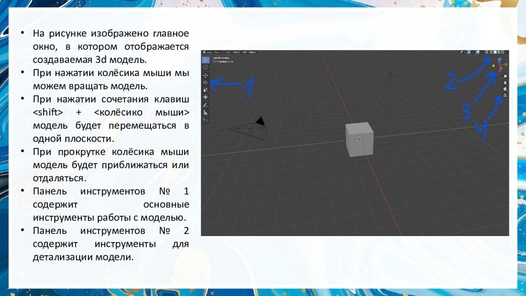 На рисунке изображено главное окно, в котором отображается создаваемая 3d модель. При нажатии колёсика мыши мы можем вращать модель. При нажатии сочетания клавиш < shift> + < колёсико мыши > модель будет перемещаться в одной плоскости. При прокрутке колёсика мыши модель будет приближаться или отдаляться. Панель инструментов № 1 содержит основные инструменты работы с моделью. Панель инструментов № 2 содержит инструменты для детализации модели.