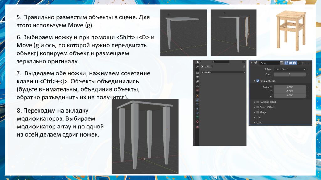 5. Правильно разместим объекты в сцене. Для этого используем Move ( g ). 6. Выбираем ножку и при помощи <Shift>+<D> и Move ( g и ось, по которой нужно передвигать объект) копируем объект и размещаем зеркально оригиналу. 7. Выделяем обе ножки, нажимаем сочетание клавиш < С trl >+<j >. О бъекты объединились (будьте внимательны, объединив объекты, обратно разъединить их не получится ). 8. Переходим на вкладку модификаторов. Выбираем модификатор array и по одной из осей делаем сдвиг ножек.