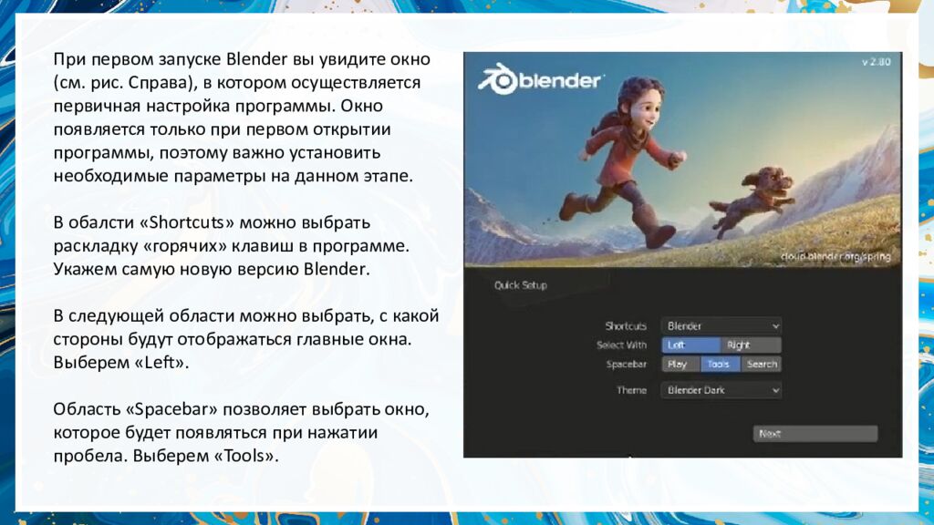 При первом запуске Blender вы увидите окно (см. рис. Справа), в котором осуществляется первичная настройка программы. О кно появляется только при первом открытии программы, поэтому важно установить необходимые параметры на данном этапе. В обалсти « Shortcuts » можно выбрать раскладку «горячих» клавиш в программе. Укажем самую новую версию Blender. В следующей области можно выбрать, с какой стороны будут отображаться главные окна. Выберем « L eft ». Область « S pacebar » позволяет выбрать окно, которое будет появляться при нажатии пробела. Выберем « Tools ».