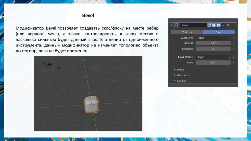 Bevel Модификатор Bevel позволяет создавать скос/фаску на месте ребер (или вершин) меша, а также контролировать, в каких местах и насколько сильным будет данный скос. В отличии от одноименного инструмента, данный модификатор не изменяет топологию объекта до тех пор, пока не будет применен.