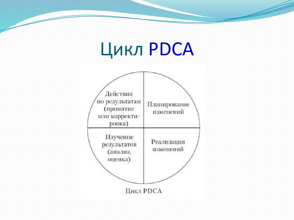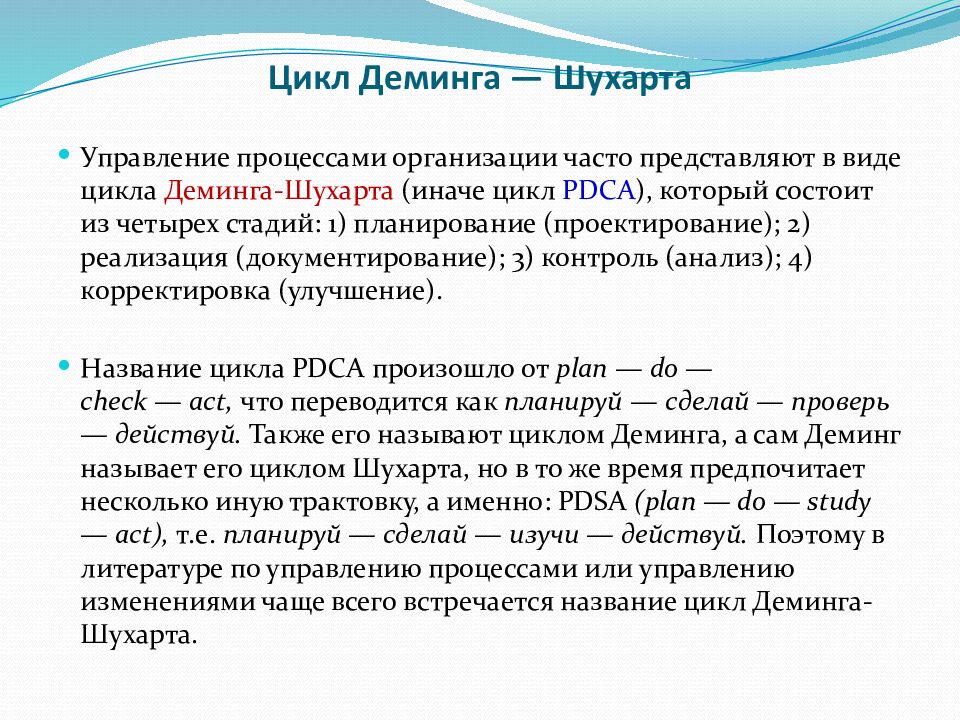 Управление процессами организации часто представляют в виде цикла Деминга-Шухарта (иначе цикл PDCA ), который состоит из четырех стадий: 1) планирование (проектирование); 2) реализация (документирование); 3) контроль (анализ); 4) корректировка (улучшение). Название цикла PDCA произошло от plan — do — check — act, что переводится как планируй — сделай — проверь — действуй. Также его называют циклом Деминга, а сам Деминг называет его циклом Шухарта, но в то же время предпочитает несколько иную трактовку, а именно: PDSA ( plan — do — study — act ), т.е. планируй — сделай — изучи — действуй. Поэтому в литературе по управлению процессами или управлению изменениями чаще всего встречается название цикл Деминга-Шухарта.