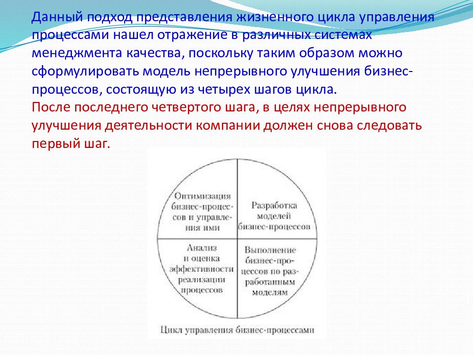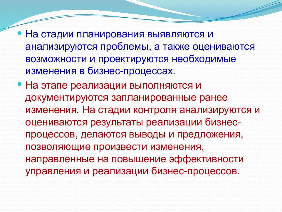 На стадии планирования выявляются и анализируются проблемы, а также оцениваются возможности и проектируются необходимые изменения в бизнес-процессах. На этапе реализации выполняются и документируются запланированные ранее изменения. На стадии контроля анализируются и оцениваются результаты реализации бизнес-процессов, делаются выводы и предложения, позволяющие произвести изменения, направленные на повышение эффективности управления и реализации бизнес-процессов.