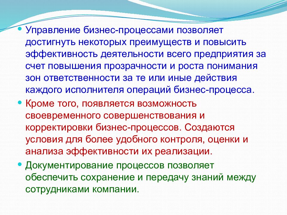 Управление бизнес-процессами позволяет достигнуть некоторых преимуществ и повысить эффективность деятельности всего предприятия за счет повышения прозрачности и роста понимания зон ответственности за те или иные действия каждого исполнителя операций бизнес-процесса. Кроме того, появляется возможность своевременного совершенствования и корректировки бизнес-процессов. Создаются условия для более удобного контроля, оценки и анализа эффективности их реализации. Документирование процессов позволяет обеспечить сохранение и передачу знаний между сотрудниками компании.
