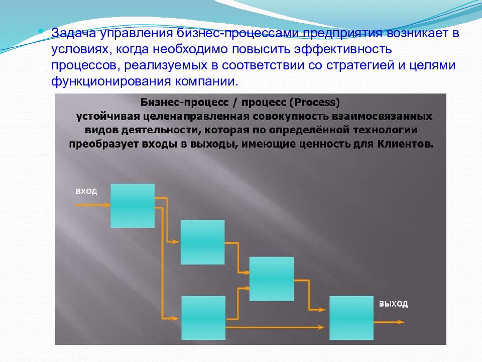 Задача управления бизнес-процессами предприятия возникает в условиях, когда необходимо повысить эффективность процессов, реализуемых в соответствии со стратегией и целями функционирования компании.