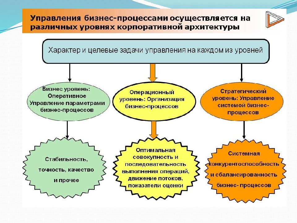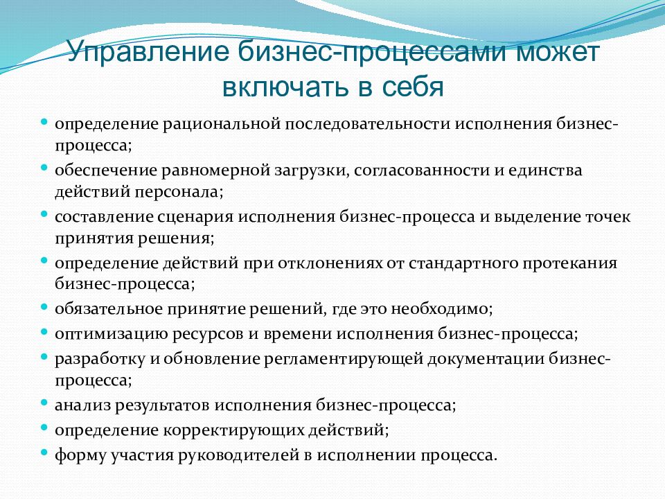 определение рациональной последовательности исполнения бизнес- процесса; обеспечение равномерной загрузки, согласованности и единства действий персонала; составление сценария исполнения бизнес-процесса и выделение точек принятия решения; определение действий при отклонениях от стандартного протекания бизнес-процесса; обязательное принятие решений, где это необходимо; оптимизацию ресурсов и времени исполнения бизнес-процесса; разработку и обновление регламентирующей документации бизнес- процесса; анализ результатов исполнения бизнес-процесса; определение корректирующих действий; форму участия руководителей в исполнении процесса.