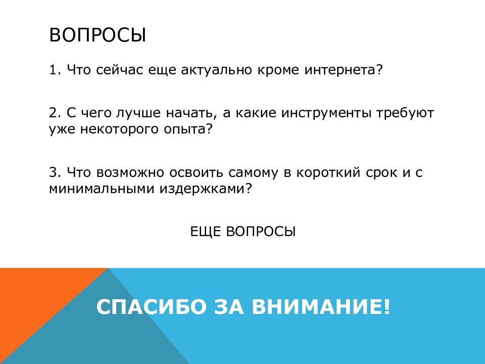 1. Что сейчас еще актуально кроме интернета? 2. С чего лучше начать, а какие инструменты требуют уже некоторого опыта? 3. Что возможно освоить самому в короткий срок и с минимальными издержками? ЕЩЕ ВОПРОСЫ СПАСИБО ЗА ВНИМАНИЕ!