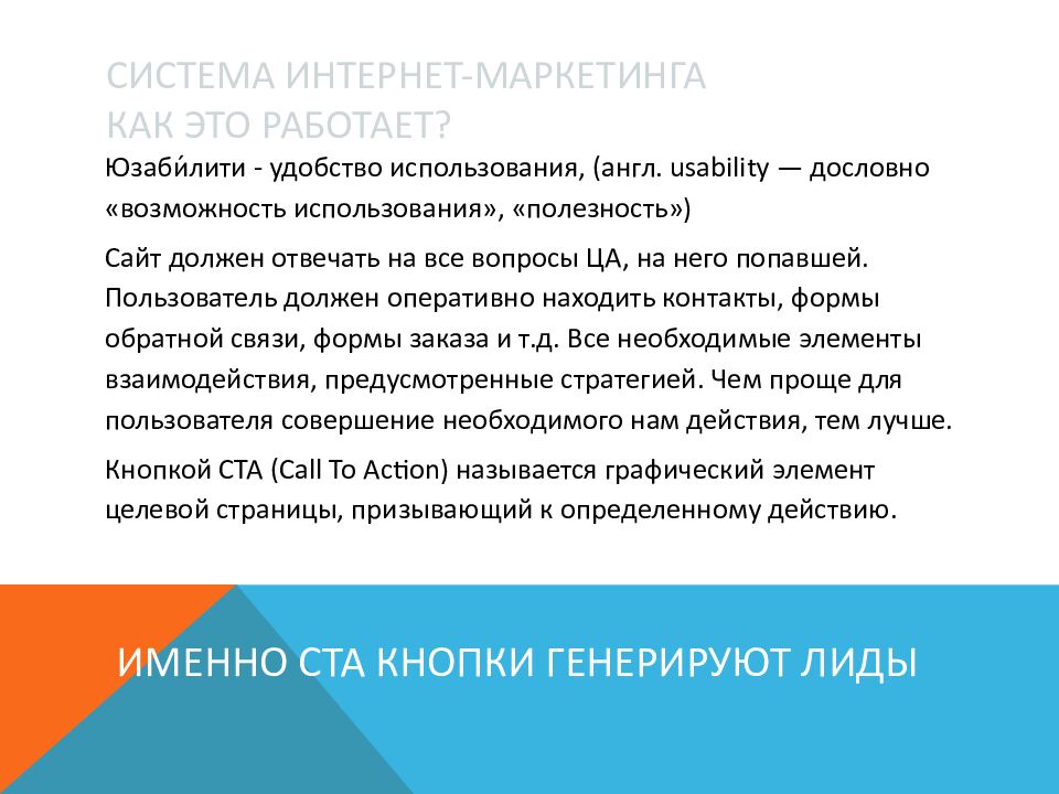 Юзаби́лити - удобство использования, (англ. usability — дословно «возможность использования», «полезность») Сайт должен отвечать на все вопросы ЦА, на него попавшей. Пользователь должен оперативно находить контакты, формы обратной связи, формы заказа и т.д. Все необходимые элементы взаимодействия, предусмотренные стратегией. Чем проще для пользователя совершение необходимого нам действия, тем лучше. Кнопкой CTA (Call To Action) называется графический элемент целевой страницы, призывающий к определенному действию. ИМЕННО CTA КНОПКИ ГЕНЕРИРУЮТ ЛИДЫ
