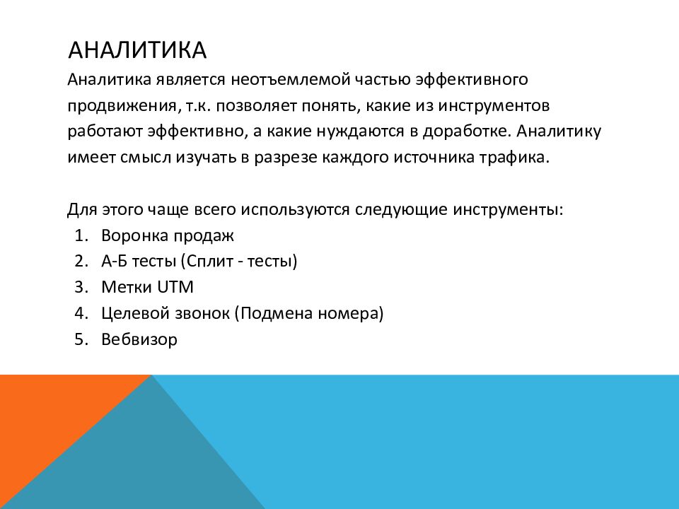 Аналитика является неотъемлемой частью эффективного продвижения, т.к. позволяет понять, какие из инструментов работают эффективно, а какие нуждаются в доработке. Аналитику имеет смысл изучать в разрезе каждого источника трафика. Для этого чаще всего используются следующие инструменты: Воронка продаж А-Б тесты (Сплит - тесты) Метки UTM Целевой звонок (Подмена номера) Вебвизор