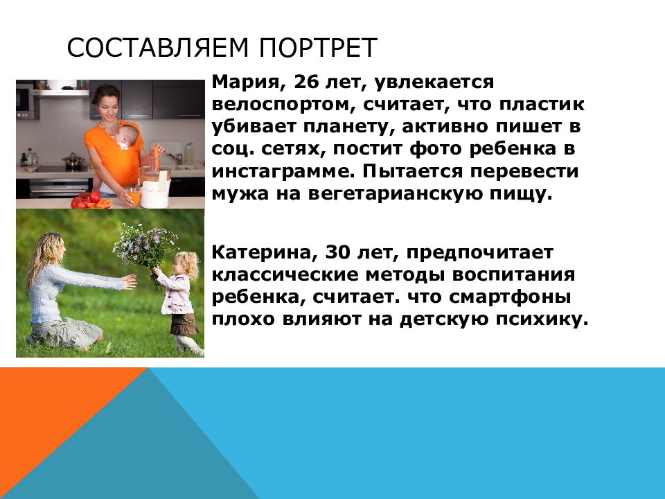 Мария, 26 лет, увлекается велоспортом, считает, что пластик убивает планету, активно пишет в соц. сетях, постит фото ребенка в инстаграмме. Пытается перевести мужа на вегетарианскую пищу. Катерина, 30 лет, предпочитает классические методы воспитания ребенка, считает. что смартфоны плохо влияют на детскую психику.