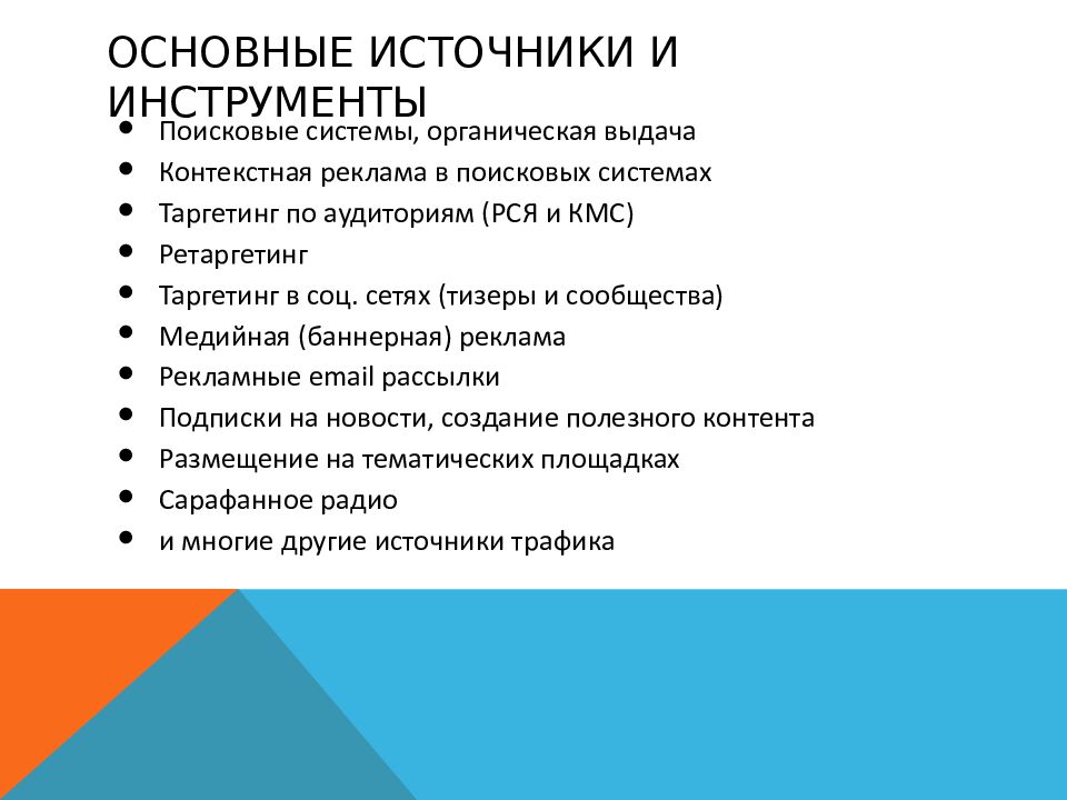 Поисковые системы, органическая выдача Контекстная реклама в поисковых системах Таргетинг по аудиториям (РСЯ и КМС) Ретаргетинг Таргетинг в соц. сетях (тизеры и сообщества) Медийная (баннерная) реклама Рекламные email рассылки Подписки на новости, создание полезного контента Размещение на тематических площадках Сарафанное радио и многие другие источники трафика