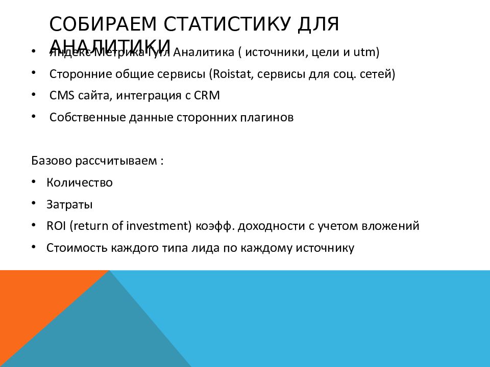 Яндекс Метрика Гугл Аналитика ( источники, цели и utm) Сторонние общие сервисы (Roistat, сервисы для соц. сетей) CMS сайта, интеграция с CRM Собственные данные сторонних плагинов Базово рассчитываем : Количество Затраты ROI (return of investment) коэфф. доходности с учетом вложений Стоимость каждого типа лида по каждому источнику