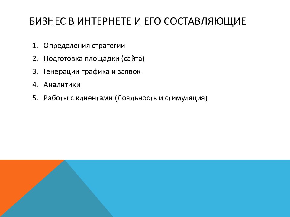 Определения стратегии Подготовка площадки (сайта) Генерации трафика и заявок Аналитики Работы с клиентами (Лояльность и стимуляция)