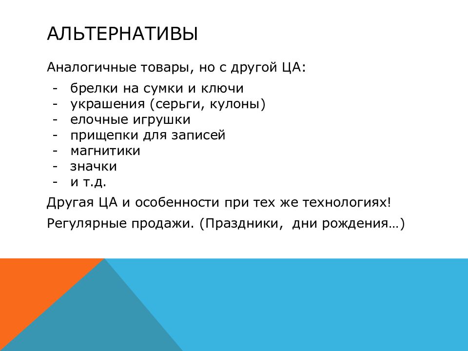 Аналогичные товары, но с другой ЦА: брелки на сумки и ключи украшения (серьги, кулоны) елочные игрушки прищепки для записей магнитики значки и т.д. Другая ЦА и особенности при тех же технологиях! Регулярные продажи. (Праздники, дни рождения…)