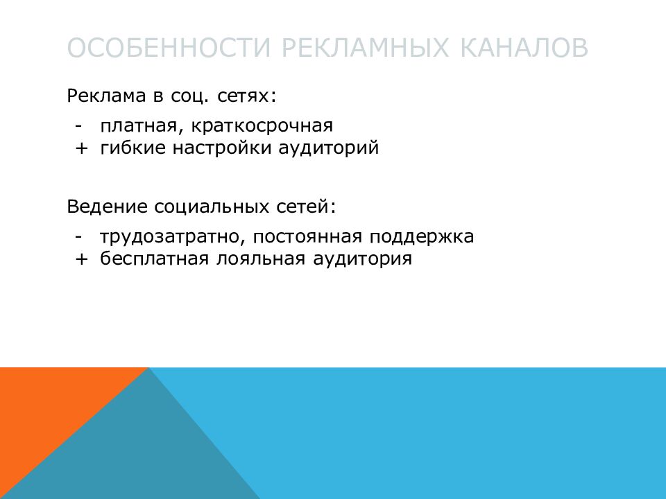 Реклама в соц. сетях: платная, краткосрочная гибкие настройки аудиторий Ведение социальных сетей: трудозатратно, постоянная поддержка бесплатная лояльная аудитория